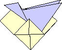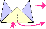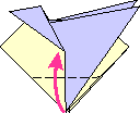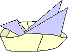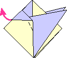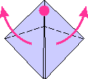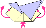 | 13 Forming the nest. Separate at the bottom and press your thumbs at the marked places to indent the paper. Now carefully continue to turn the paper outside in until you have a nest. ( Note: the triangles folded in step 11 should end up inside the nest. ) | 14 Here is the completed Bird-in-A-Nest! | ||||