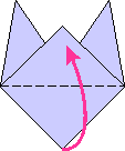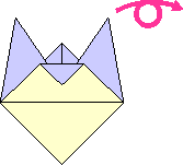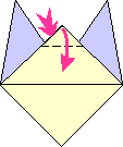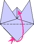 | 5 Fold down about 1/3 for bird's beak. | 6 This should be the result. Turn over. | 7 Fold lower point up. | 8 Put thumbs in opening at the bottom and squash sides together. See the next step. | ||