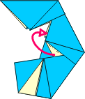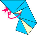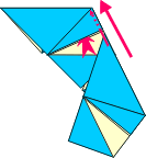 | 8 Open joining corner and loosen flap as shown. Push corner into pocket. | 9 Mountain fold both layers inside as in step 5. (Handle carefully). | 10 Joined. Add third module. | 11Repeat steps 8 and 9 with remaining modules. | ||